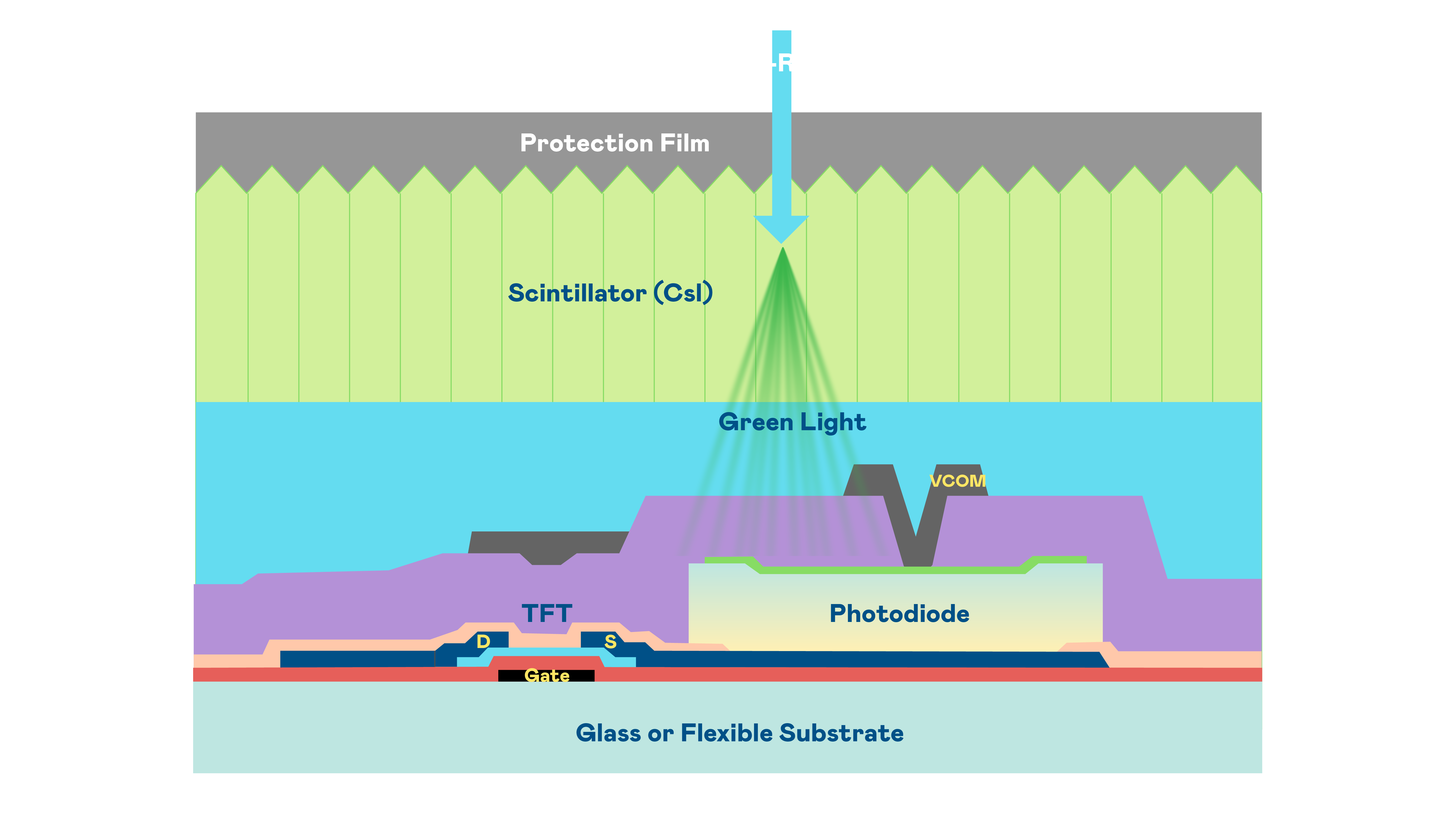 彩神Vll的X光影像感測陣列使用薄膜電晶體 (TFT) 作為每個像素的讀取開關,搭配光電二極體(Photodiode)的光電轉換元件,用以感測X光影像訊號。